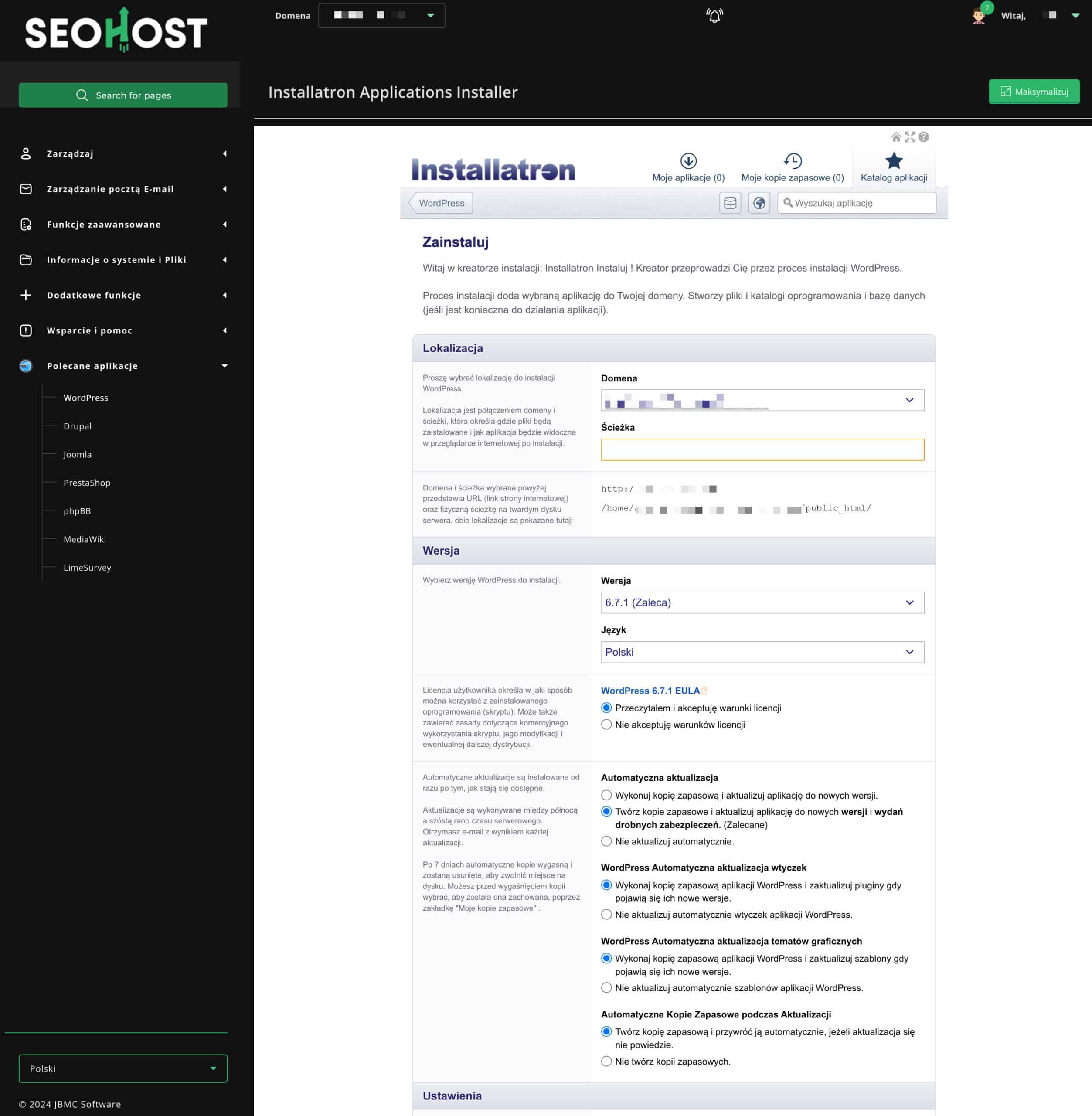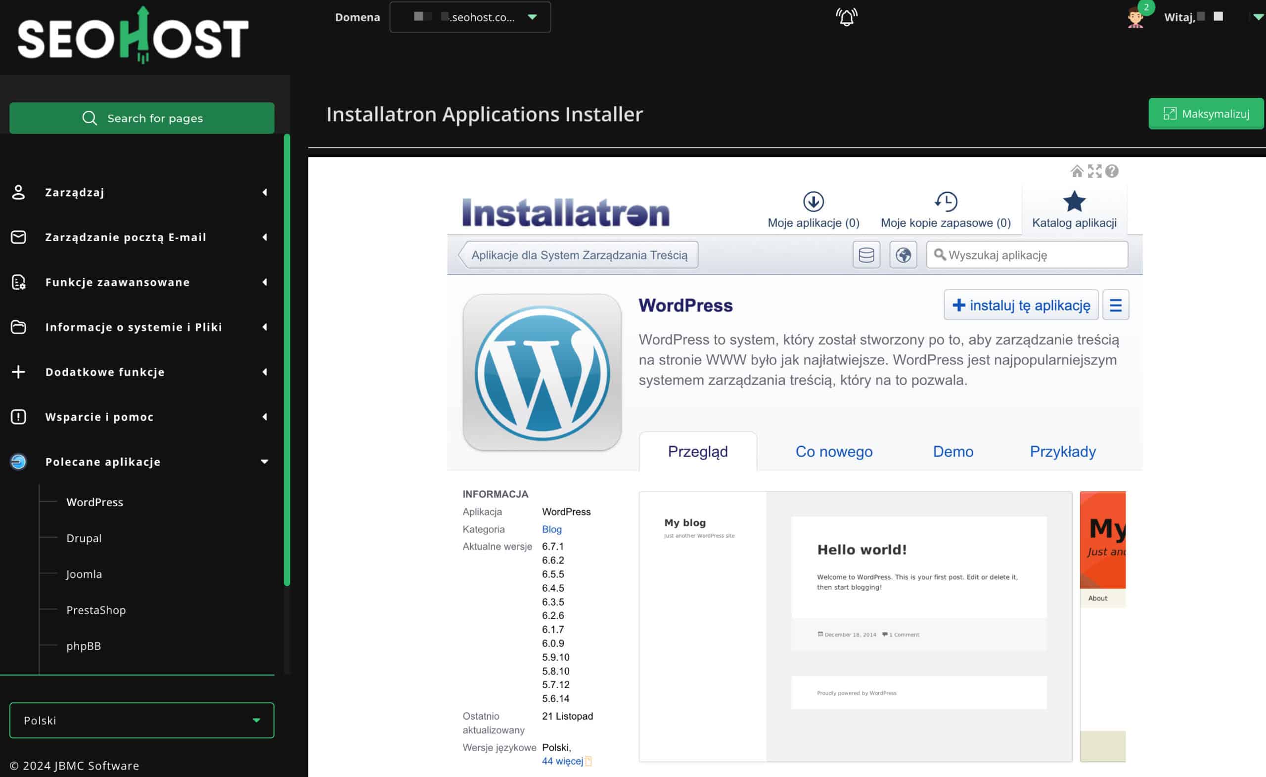 Hosting Seohost dysponuje standardowym autoinstalatorem — Installatron. Jest on prosty w obsłudze i pozwala za pomocą kilku kliknięć uruchomić WordPressa na hostingu.